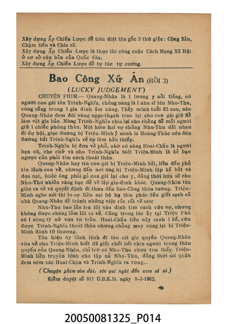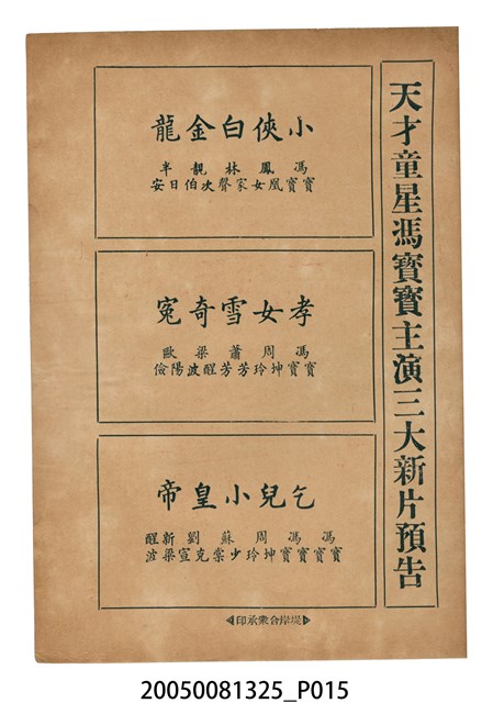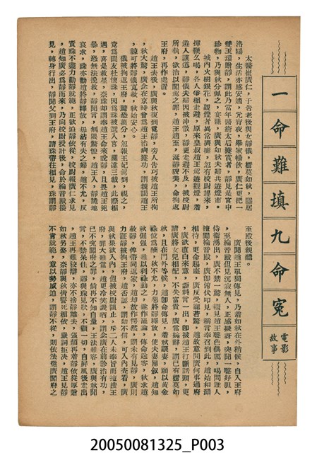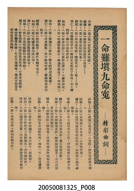 本件保存良好,彩色印刷,為一命難填九命冤電影本事。由任劍輝、羅艷卿主演,導演珠璣,牡丹公司出品。背面為電影親情。