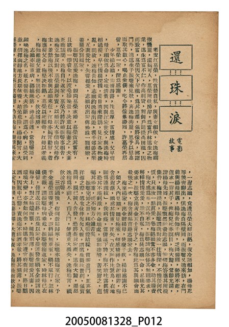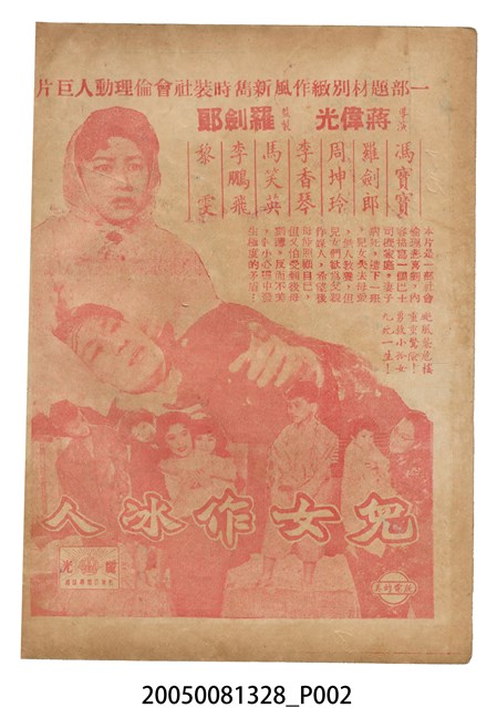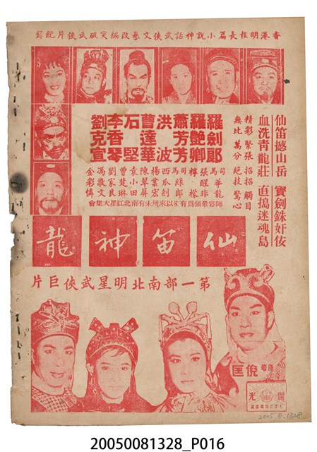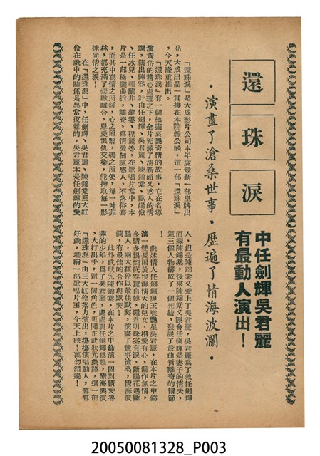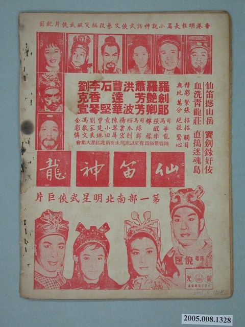 本件保存良好,彩色印刷,為還珠淚電影本事。由任劍輝、余麗珍主演,導演龍圖,麗光影業出品。背面為電影仙笛神龍。
