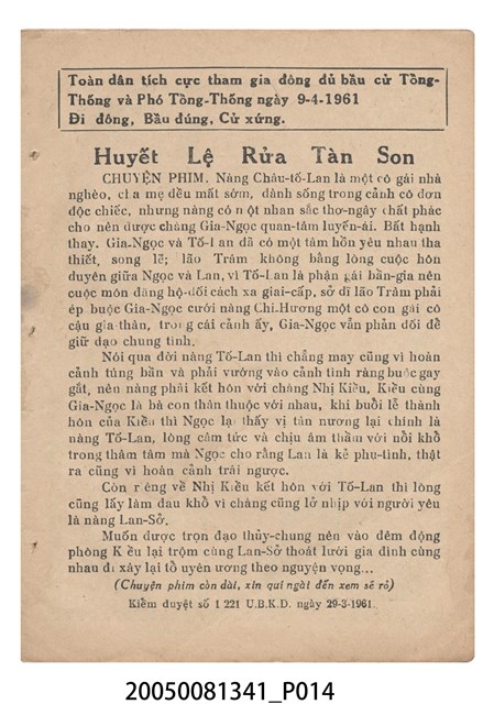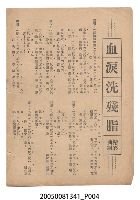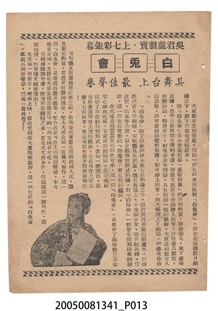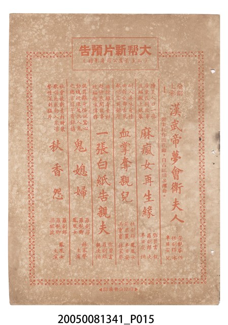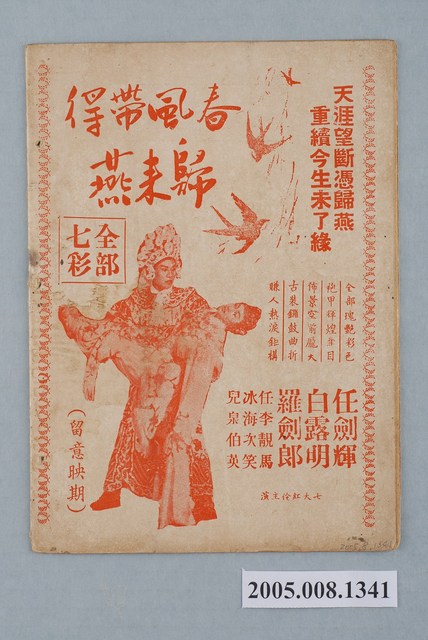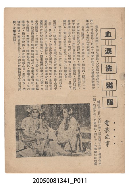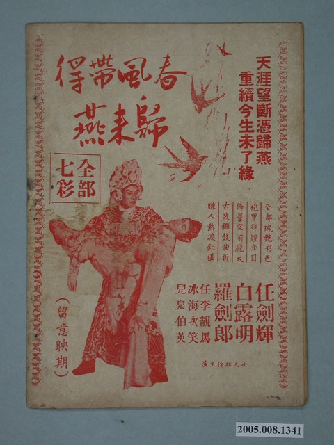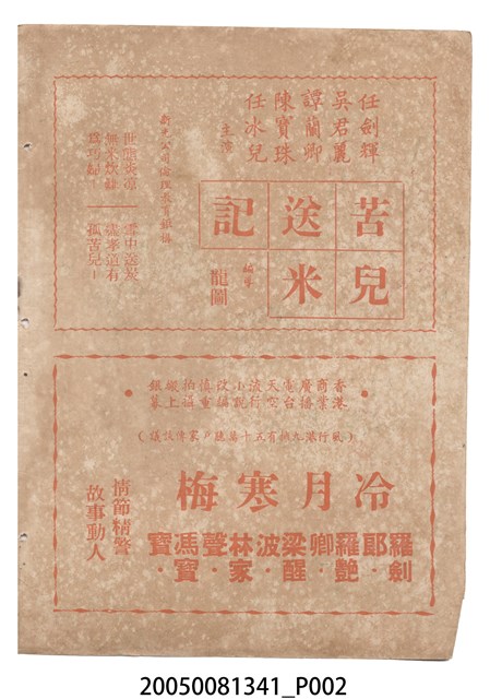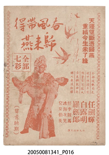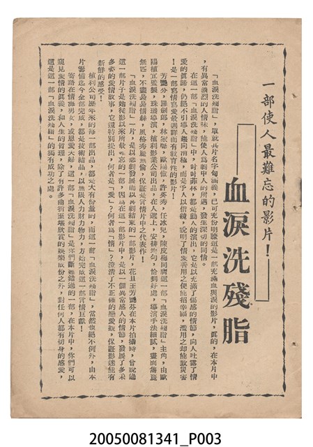 本件保存良好,彩色印刷,為血淚洗殘脂電影本事。由黎聞、芳艷芬主演,導演珠璣,二多影業出品。背面為電影春風帶得歸來燕。