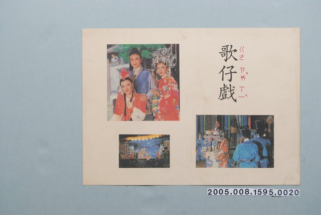 本文物為三張歌仔戲圖片圖卡組,教學用,為長方形的彩色照片,並有黑色的歌仔戲字樣以及紅色的ㄍㄜㄗㄞˇㄒㄧˋ注音符號。照片內容有歌仔戲演員、歌仔戲戲臺和歌仔戲演出。