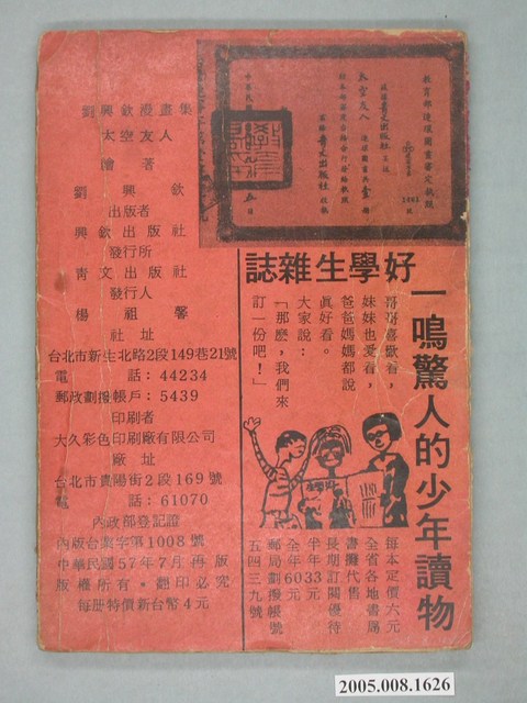 1.本件《劉興欽漫畫集17-太空友人》,由興欽出版社出版,青文出版社發行,民國57年出版。以兩位小朋友遇到太空船為封面,講述小朋友遇到外星人的故事。2.劉興欽於1934年出生於今新竹縣橫山鄉,1954年開始畫漫畫。其正式投入漫畫,是擔任北市永樂國小教師期間。1971年到1979年從事發明,獲得國內專利140多項、國際專利43項。於1991年移民美國舊金山,在《北美世界日報》連載漫畫「大嬸婆在美國」,並於舊金山創立「大嬸婆創意學校」免費教導華人子弟學習母語,同時也致力於「臺灣民俗紀錄」畫作,至今已經累積300多幅作品。該漫畫家以〈阿三哥與大嬸婆〉等漫畫,著稱於世。