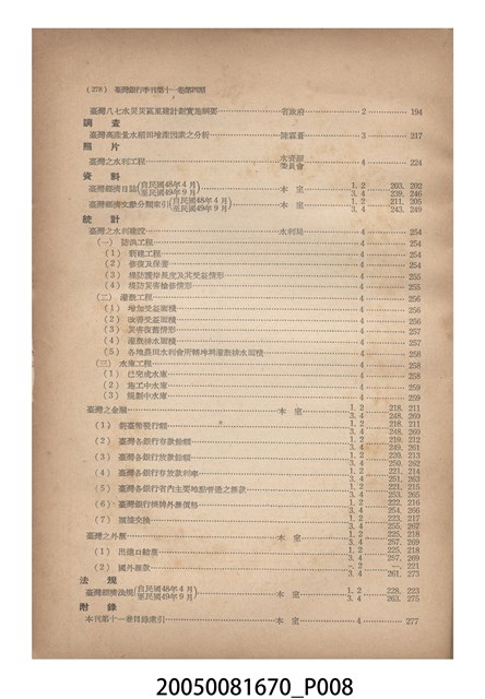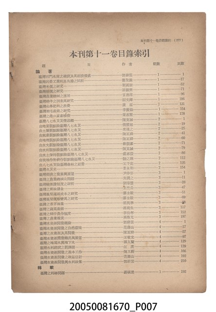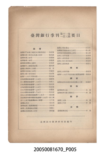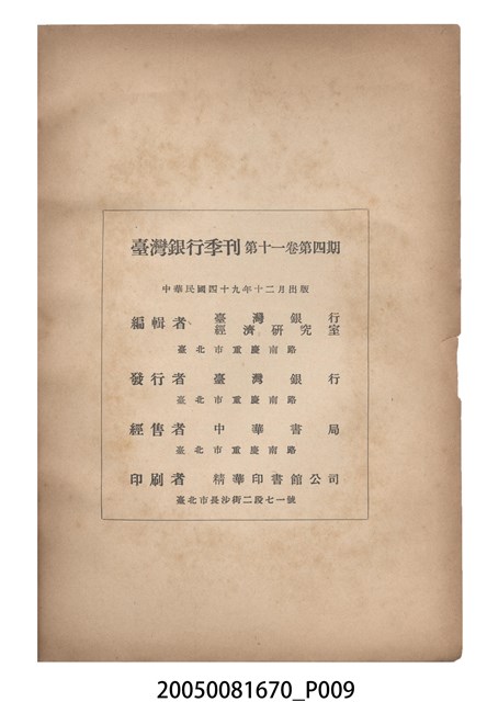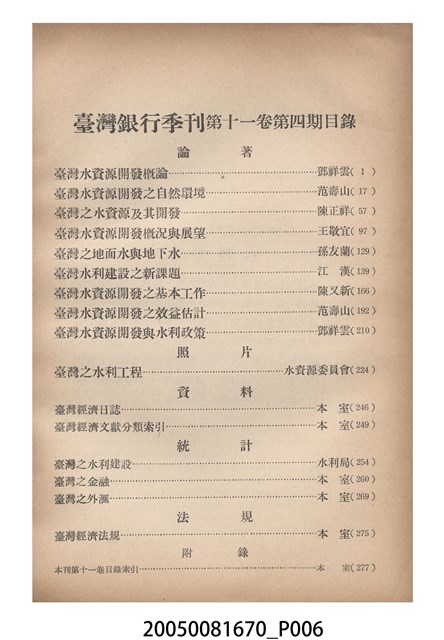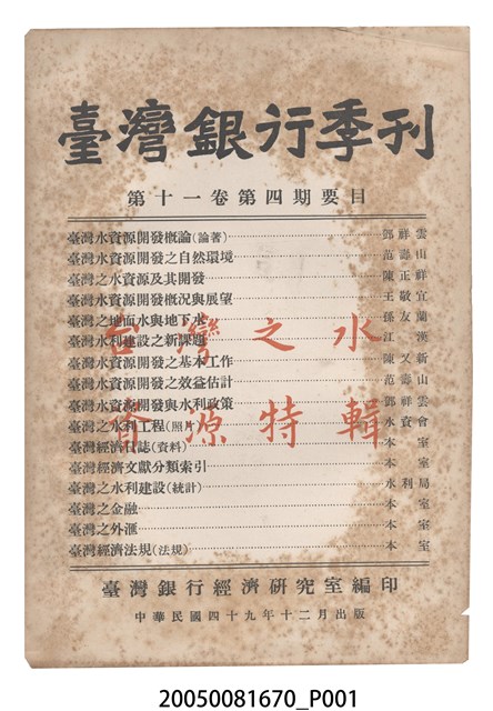 1.本物件為臺灣銀行經濟研究室編印《臺灣銀行季刊》第11卷第4期,為紙質,呈方形,為書籍,封面有「臺灣銀行季刊」、「第十一卷第四期要目」、「臺灣銀行經濟研究室編印」、「中華民國四十九年十二月出版」黑色字樣,與「台灣之水資源特輯」紅色字樣,及本期目錄,封底無圖案字樣,其內容主要為本季刊第11卷各期要目,及臺灣銀行經濟研究室編印刊物介紹,與本季刊第11卷各期目錄索引,另本期內容有「臺灣水資源開發概論(論著)」、「臺灣水資源開發之自然環境」、「臺灣之水資源及其開發」、「臺灣之水資源及其開發」、「臺灣水資源開發概況與展望」、「臺灣之地面水與地下水」、「臺灣水利建設之新課題」、「臺灣水資源開發之基本工作」、「臺灣水資源開發之效益估計」、「臺灣水資源開發與水利政策」、「臺灣之水利工程(照片)」、「臺灣經濟日誌(資料)」、「臺灣經濟文獻分類索引」、「臺灣之水利建設(統計)」、「臺灣之金融」、「臺灣之外匯」、「臺灣經濟法規(法規)」共16篇文章,發行者為臺灣銀行,印刷者為精華印書館公司。