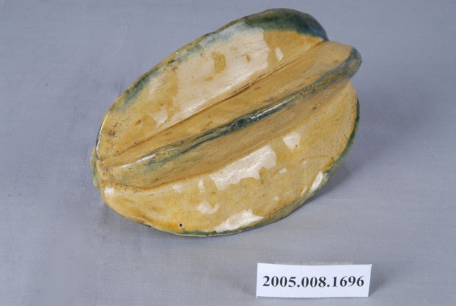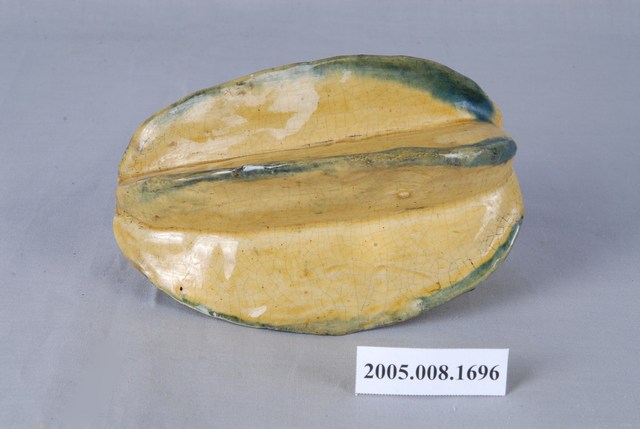 1.本件南投燒楊桃造型擺飾通身以陶土壓模製作,呈長12.5公分,寬7.3公分,高7.6公分,外型仿造水果楊桃造型,其果實帶有五道稜線,剖面圖呈現五芒尖菱星狀。楊桃表面施以黃色釉料後,於果稜處以綠色釉料裝飾,試圖呈現楊桃果實成熟的樣貌。2.早期南投所產陶器,陶土質地具有彈性、黏性高、深紅結實。其燒製陶器㪋分為粗陶器與細陶器兩大類。細陶器多為富有人家訂製或特殊要求燒製,數量較為稀少。日用陶器大體為粗陶大宗,如缸、甕、罐、缽等,且素燒比釉燒更為普遍。日治時期,南投的窯業受到日本政府重視。其中精緻陶器邁向專業生