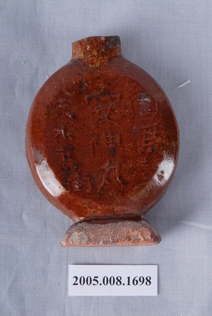 本物件為南投燒藥罐。藥罐為磚紅色,罐口窄小,罐身呈扁平圓形,下方有底座。罐身兩面有字,一面可辨識出的字體有熱和咳,另一面可辨識出的字體有安神丸。