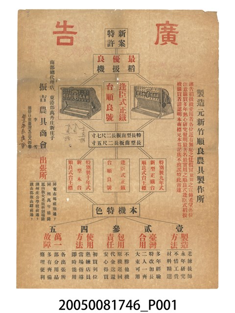 本物件為新竹順良農具製作所稻扱機廣告,紙質。裡面介紹其機型,如特長型齒板長二尺七寸、長型齒板長二尺五寸,以及本機特色(製造方法、臺灣合用、包用責任、使用方法、萬一故障)等五項。南部總代理店為東港郡萬丹庄新庄子。