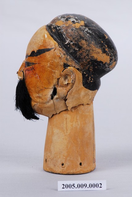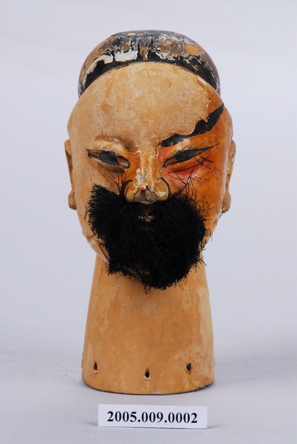 本件保存尚可,為布袋戲角色武老生(阿森頭)之戲偶頭,偶之特徵為細目、黑帽及黑鬍,缺少右眉。