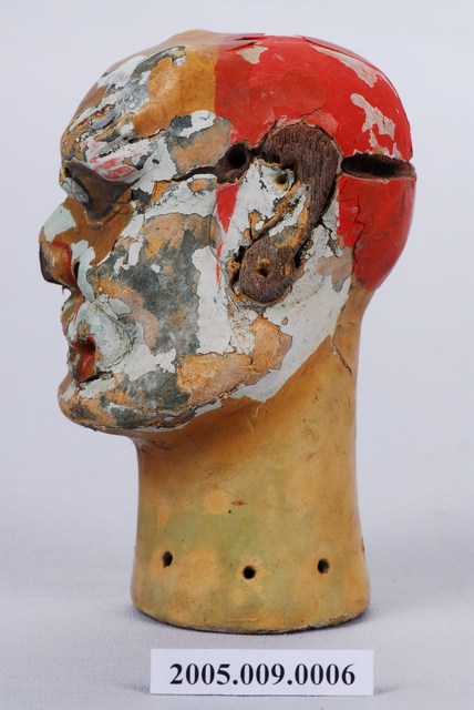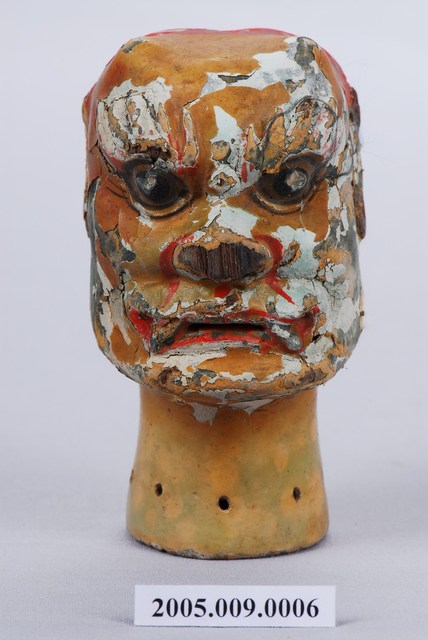 本件保存尚可,為布袋戲角色怪頭之戲偶頭,偶之特徵為花面,鼻子及後腦部分有缺損。