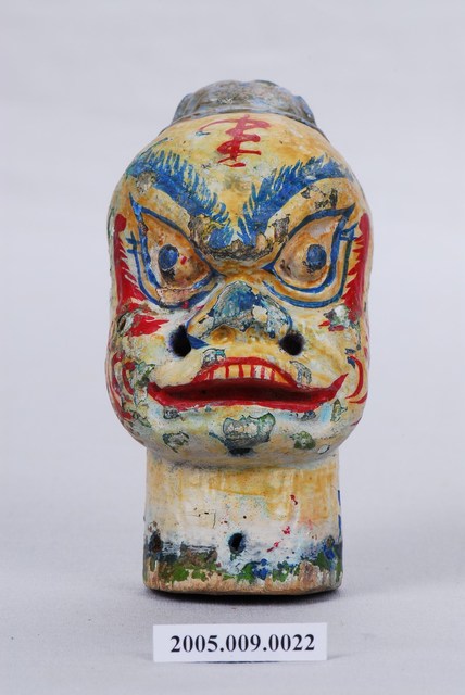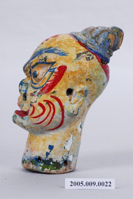 本件保存尚可,為布袋戲角色青花怪頭仙之戲偶頭,偶之特徵為藍色花面及露齒,偶頭已褪色。