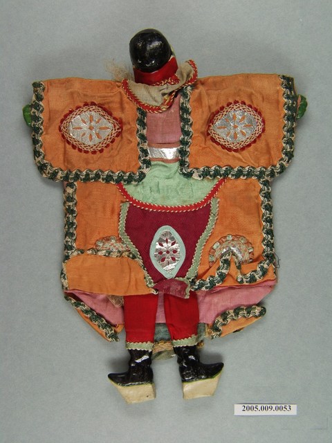 本件保存狀態良好,為布袋戲土黏香之戲偶,身著橘色長袍,皆繡有花紋及綠金色滾邊,紅色長褲,黑色鞋子。偶頭紅唇白臉綠眉,額頭臉頰皆有紅色圖樣,鬍鬚金色長及胸。
