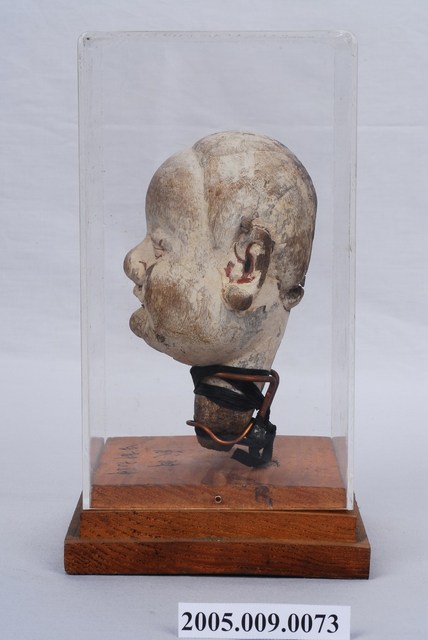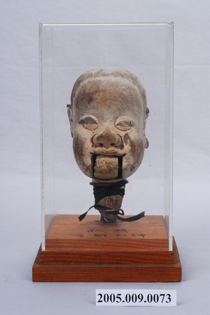 1. 本物件為清代泉州製作的原鄉傀儡戲偶頭-戲神田都元帥,偶頭為木製,色彩幾乎不存,田都元帥此角色在宗教、除煞橋段皆不可或缺,是具代表性及歷史性的角色。2. 民間俗稱傀儡戲為「嘉禮戲」,意指傀儡戲用於酬神時,乃是最「嘉」(佳)之「禮」。傀儡戲是由演師抽動傀儡的絲線表演,操縱線越多,傀儡能展現的動作也越加細膩精巧。3. 臺灣各式傳統戲曲中,以臺灣傀儡戲的儀式性最明顯,也最強烈。它是由道士與演師於儀式中共同完成儀式與劇場表演活動,甚至必要的時候傀儡戲演師可以獨力完成儀式與戲劇的演出。