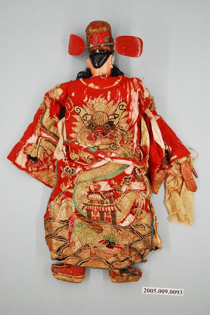 1. 本物件為南臺灣傀儡戲偶師仿布袋戲偶刻製,戲偶造型為「淨」的角色,身著紅色蟒袍及頭戴紅紗帽,面部為白臉黑鬚。戲偶狀態完整,絲線部分不存,戲衣部分地方破損,戲偶偶頭面部顏色有部分剝落。2. 一般臺灣傀儡身上用線數目不固定,依照人物、性別、身份、年齡、個性而有分別。戲偶的手腳露出戲服外以木刻之,藏在戲服內的部份則用軟布:偶的上身以竹篾編成,穿上內衣、內褲、彩褲、戲服,宛如生人著衣一般。南部傀儡戲偶較矮,身長約2尺,提線板以木板削成,後面有一長形圓柱,操縱時左手握其上,右手抽線。