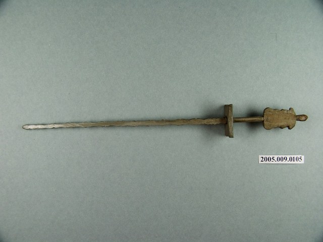 本件為傀儡戲道具硬鞭,木頭製作上銀漆,鞭有硬、軟之分,硬鞭屬短兵器,四稜剖面有稜有節。硬鞭是提供戲偶持拿的道具。傀儡戲是由演師抽動傀儡的絲線表演,操縱線越多,傀儡所能展現的動作也越加細膩精巧。