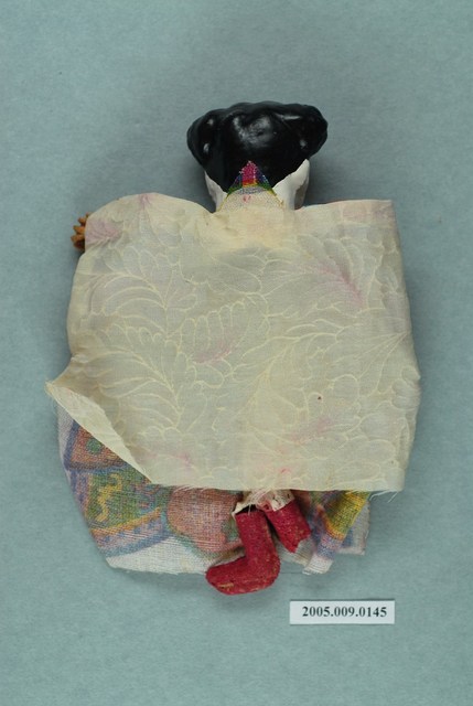 1.本件土黏香戲偶人像女偶是帶有布製偶身及手、腳的戲偶,為花旦造形,白色的臉,兩頰有粉色腮紅,黑色頭髮、眉毛、眼睛,紅色小嘴。布製偶身正面有葫蘆及圓形、流蘇等多種印刷圖案,背面為素色的布,雙手為握拳狀,手中可以放置其他道具,雙腳為紅色鞋子。2.戲偶俗稱「尫仔」,由偶頭、偶身、手、腳、服飾、裝飾等組成,偶頭多以木刻、紙糊等材質製做出形貌,外觀再上漆或彩繪。臺灣早期戲班使用的偶頭大多從泉州進口,稱為唐山頭,其中以「花園頭」、「塗門頭」最有名。「土黏香」戲偶偶頭是以線香香料混合木屑製作而成的戲偶偶頭。