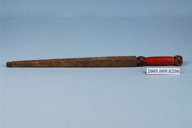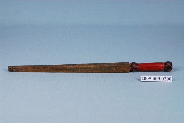 本件子弟戲兵器木製方型無節打神鞭是以方形木棒雕刻而成,握把修飾成圓形,握柄兩端修飾成菱形狀,打神鞭本體並無分節狀,最尾端修飾呈略圓的菱形狀,握柄塗上紅色漆,握柄兩端塗上黑色漆,邊角處的漆多已脫落,打神鞭部份保留木材原色,邊角處略有磨損情形,大致保存完整。