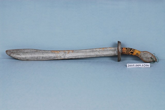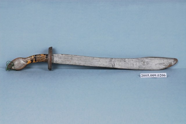 本件子弟戲兵器木製帶柄刀是以木片雕刻而成的帶柄刀,方形刀柄尾端略大,鑽有一小孔,穿一條綠色尼龍繩,繩尾打死結,刀柄纏繞著格狀塑膠布,刀身略呈彎弧狀,有刮兩條細凹槽,刀柄、刀身、護套皆塗上白色漆,刀柄、刀身有部份因磨損掉漆情形,大致保存完整。
