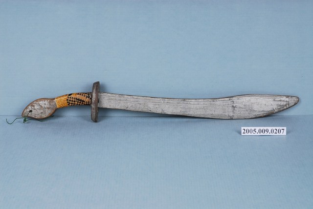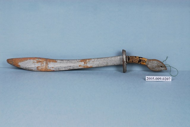 本件子弟戲兵器木製帶柄刀是以木片雕刻而成的帶柄刀,方形刀柄尾端略大,鑽有一小孔,穿一條白色綿繩,繩尾打死結,刀柄原有的纏繞物已經脫落,刀身略呈彎弧狀,有刮兩條細凹槽,刀柄、刀身、護套皆塗上白色漆,刀柄、刀身有部份因磨損掉漆情形,大致保存完整。