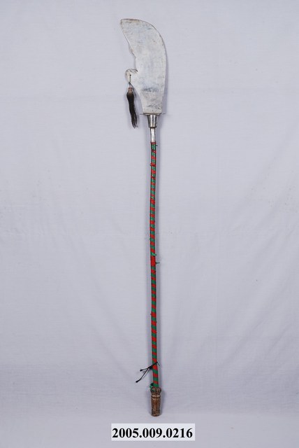 本件子弟戲兵器金屬製關刀的刀面鑽一小孔,綁上一串黑色流蘇,刀柄最末附有木製握把,刀柄以橘、綠兩色塑膠布螺旋相間纏繞,近握把處綁有一條黑色尼龍繩。
