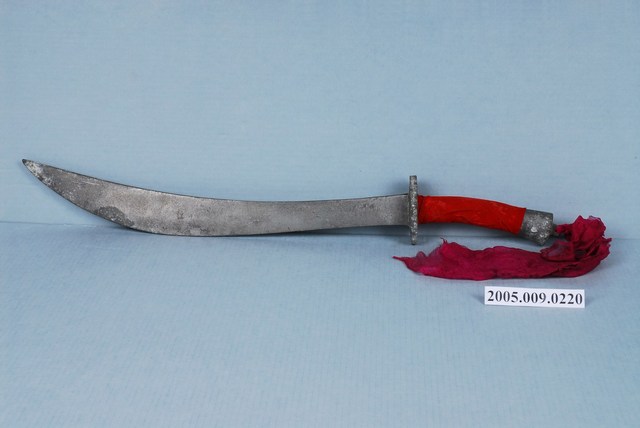 本件子弟戲兵器金屬製帶柄刀的刀柄纏繞著紅色絨布,刀柄尾端綁著紅色布,護套為橢圓形,刀身呈彎狀,尾端呈白色班,保存完整。