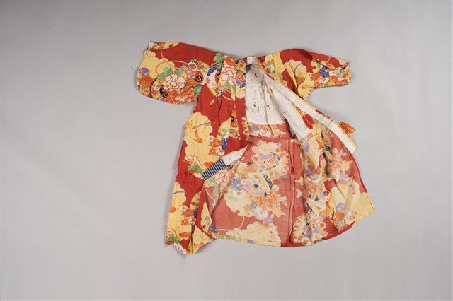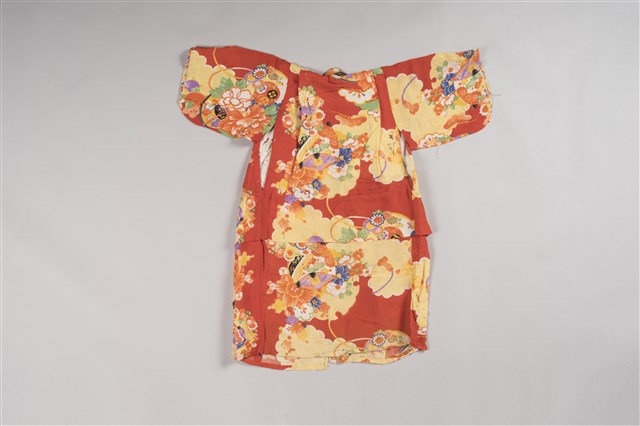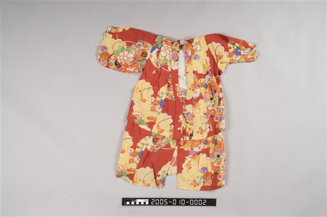 1.此服屬於曲領、交襟、右衽的和服式童衣,雙層結構,表布以鮮豔的橘紅色底布印上各式花卉,裡布為白色棉布,傳統和服的製作都是為手工縫製為主,此件服裝也是手縫製作,從剪接處可以看見明顯的接縫線和針黹的痕跡。2.和服(kimono)是日本的民族服飾,明治時代(1868年–1912 年)以來,日本服裝主要分為「洋服」(現代服裝)和「和服」(傳統服裝),因西方衣服(即)的流入,遂用「洋服」以將其與日本本地的衣服作分別,加上19世紀末20世紀初,日本國族運動興起,產生了大和民族的概念,後來為了將西方的衣物作分別,「和服」逐漸演變成單指日本民族服飾的專稱。