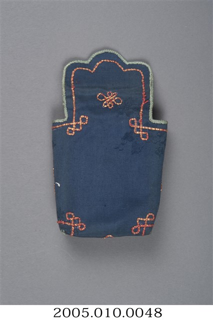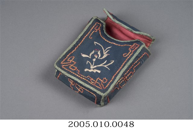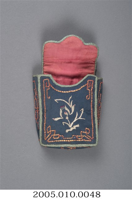 1.本件為藍色底布的長方體煙袋,從上方開口可知裡布為紅色。煙袋正面以纏針繡有牡丹,寓意富貴,邊框以金、紅色線作釘金繡繡枴子龍,而煙袋的其他面則以金、紅色線作釘金繡繡枴子龍裝飾。2. 本件購藏自蘇麗嬌女士。煙袋為早期先民常見配飾,有繩可佩掛在腰間,用以放置煙草,方便外出需要吸菸時取用。此件洋煙袋的型制為配合洋菸的捲煙形式,與傳統荷包式煙袋不同。