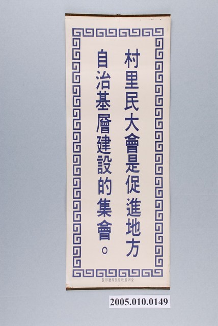 此物件為標語,製作單位為臺灣省政府民政廳,白底藍字,內容為「村里民大會是促進地方自治基層建設的集會。」 現今臺灣村里鄰地方制度始於1945年行政長官公署為便於管理而發布「臺灣省各級民意機關成立方案」,其中本件所提到的村里民大會,最早始於1946年開始舉辦,而相關實施辦法中華民國政府來臺後於1949年先後發佈「臺灣省各縣市村里民大會推行辦法」、「臺灣省各縣市村里民大會政治訓練辦法」、「臺灣省各縣市政府督導村里民大會成績考核獎懲辦法」,明令村里民大會為政令宣傳、促進自治、政治訓練的重要場域。村里民大會相關規定皆是行政命令並由省政府、中央政府一手掌握,此狀況直到1999年依中華民國憲法增修條文而制定「地方制度法」後,村里民大會的相關規定才真正的掌握在地方政府手中。