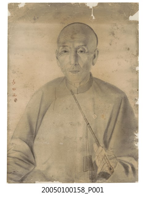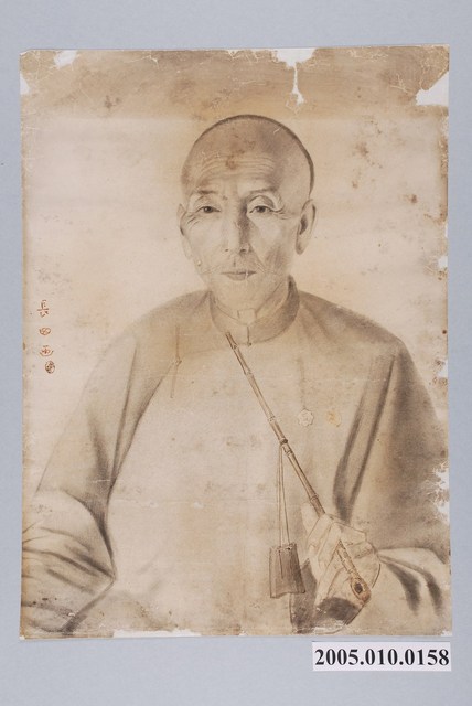 本件日治時期新埔紳士半身畫像,頭髮為清代辮髮模樣,略上年紀,有皺紋、魚尾紋,留鬍子,身穿傳統長袍,左手持竹製煙斗,上面掛著煙袋,左側有畫師留款「長田画」,下面蓋「長田」的橢圓形章,外表斑駁有污漬,邊緣有多處老舊剝落情形,已重新裱貝。