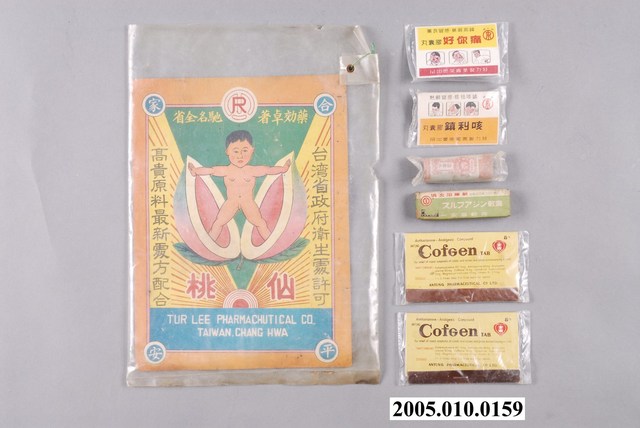 1.本件綜合藥品配置部「仙桃」寄藥包,共一組7件,包含藥品紀錄單1張、安東「克風錠」2包、特力「咳利鎮」1包、特力「痛你好」1包、新原「濟眾水」1瓶及「安寧」軟膏1條等6包藥品。六包藥品皆用透明塑膠袋密封保存,藥品紀錄單及厚質透明塑膠袋組合成寄藥袋,用來承裝寄放藥品,透明袋上一角有一孔可穿繩吊掛牆上。2.臺灣的寄藥包源自日本的「家庭配置」售藥制度,日治時期傳入臺灣。寄藥袋裡承裝各式家庭常見成藥,透過臺灣總督府衛生課認可的製藥所或藥房的派遣員將走訪城鄉,將寄藥袋寄放於各個家庭提供緊急治療時使用,並定期到府結帳與更換過期藥品,因為使用方便,價格合理,二戰後仍盛行,至1970年代臺灣醫療普及後逐漸式微。3.日治時期及二戰後初期寄藥袋為紙製,後期因為消費形態改變,寄藥次數減少,改為寄放罐裝或盒裝藥品,故逐漸演變改為更大的透明袋或其他提袋帶來承裝藥品。