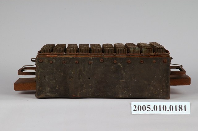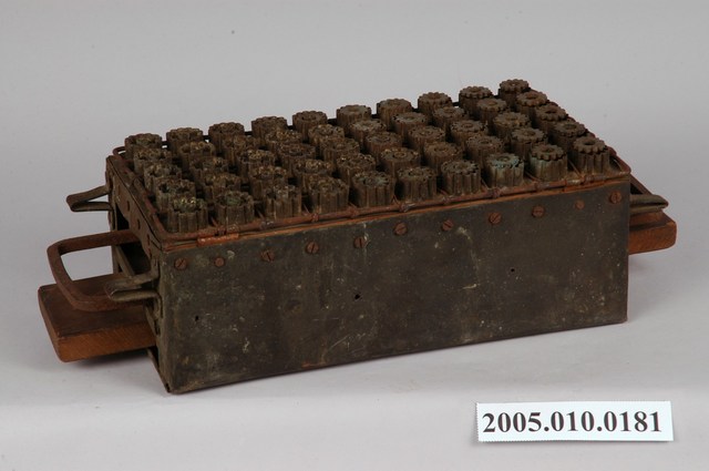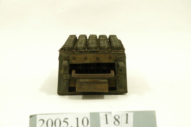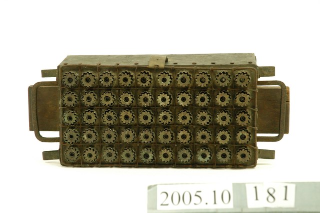 製作花朵形狀的模具,整體為中空的箱形結構。主結構以木料裝釘而成,頂部的壓模、周邊與底部均為銅質。中空的箱體部分,上部有貫穿兩端的鐵把,下部有貫穿兩端的木把。頂部的壓模設計成五十個花朵狀的壓模,每個花朵中間有孔洞,用以使麵皮中間形成圓狀凸起或是圓孔以便穿繩成串。因年代略久,木料處多有破裂磨損泛黑,鐵釘與鐵把處明顯生鏽,花朵狀的壓模處有鏽蝕銅綠的狀況。