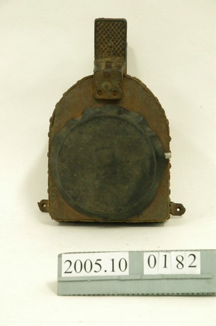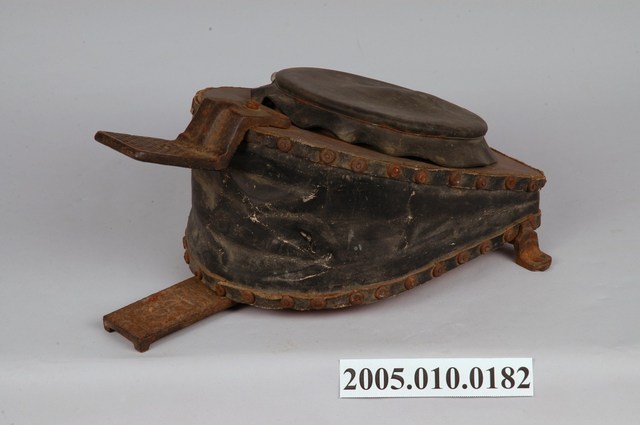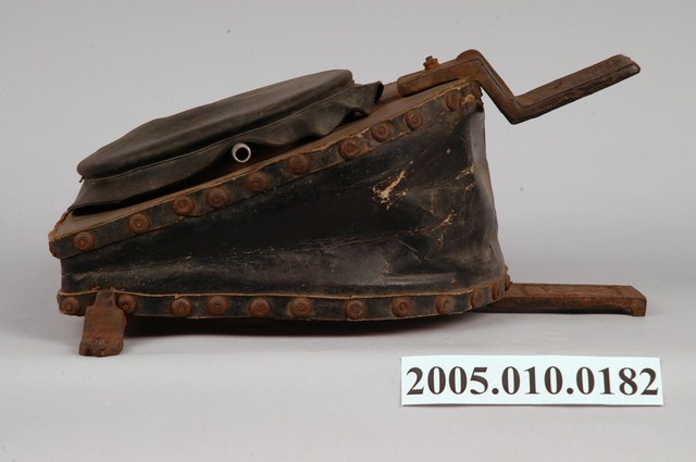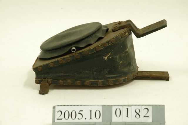 本物件為日治時期灌風器,此物件為充氣的器具,大體上具呈現扇形狀,上方有一圓形凸起,下方有小的鐵架支撐,由於部分為鐵製材質,所以有橘色的生鏽痕跡。當操作者壓下把手時,外部空氣流入密閉氣室內,充氣嘴連接要充氣的物件,以把手重複按壓來回運作,氣體流入物件,進行充氣。
