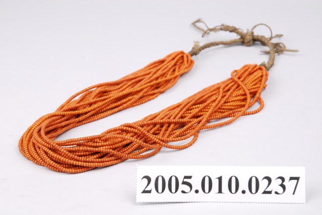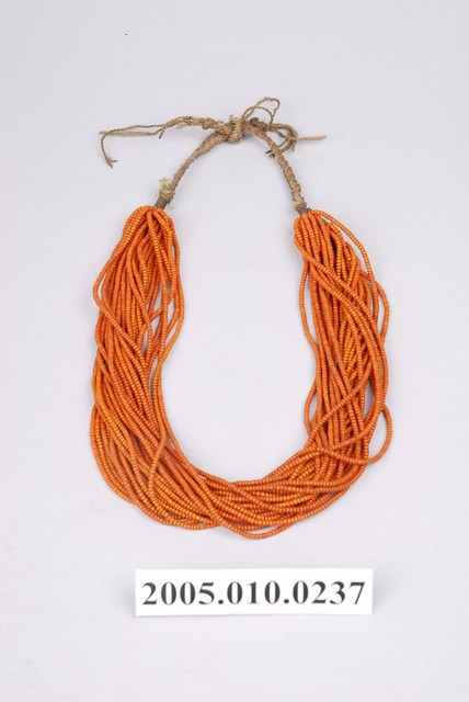 此項飾為數十條單串珠串所串連而成的複串項飾。項飾以麻為繩,先將黃色單色細小琉璃珠串成單串,再將數串單串集結成束。珠串頭尾端麻線相互纏繞編織成辮,兩辮相交打結成圈,穿戴時可依整體服飾搭配隨意調整徑圍。此件項飾的琉璃珠顏色明亮略帶光澤,珠子彼此緊密排列交錯,十分具有層次感。