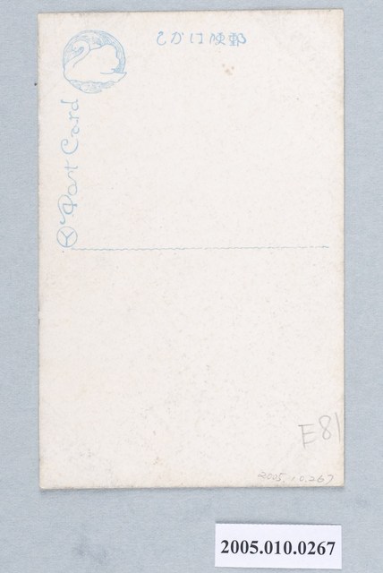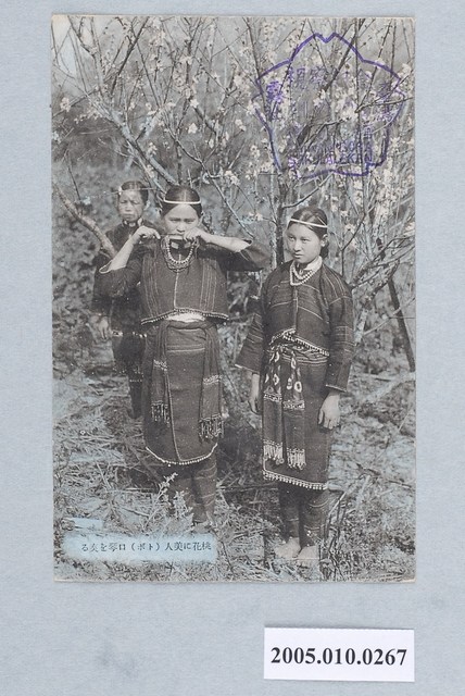 1.本物件以原住民為主題,黑白樣式。正面為三名原住民女性站立在櫻花樹下。右方兩名女子身著原住民傳統服飾,頭戴淺色頭飾,其中一位為赤腳,另一位手上拿著口琴放在嘴邊。明信片右上角有一藍紫色櫻花戳章,可見可見「視察紀念」、「臺灣霧社」等字樣。明信片左下角以漢字與日文書寫「桃花に美人(ㇳボ )口琴を奏ろ」(大意為美人吹奏口琴)。背面右上角為郵票黏貼處,該處有一天鵝圖像,右側有以漢字、平假名書寫之「郵便はがき」,上方以英文字母書寫「POST CARD」。2.口簧琴為彈撥樂器,是臺灣原住民族群,除了蘭嶼的達悟族之外普遍均有的樂器,製作方式為將竹片中間切空,鑲入銅片或切割竹片時,留置中間細長的竹片將其削薄,在兩邊固定繫繩後,以口為共鳴箱,右手發繩、左手固定以發出聲音。