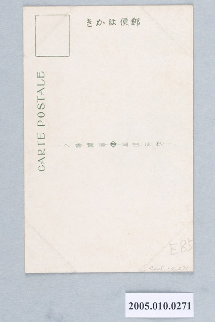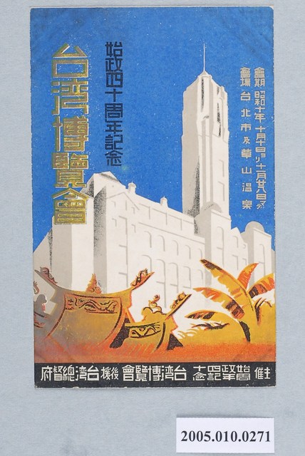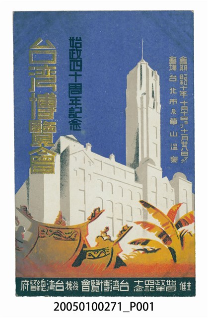 1.本物件以始政四十週年紀念臺灣博覽會為主題,彩色樣式。正面為始政四十週年紀念臺灣博覽會之宣傳照片,白色建築物為臺灣總督府,下方以橘色繪出廟宇屋頂、棕櫚樹葉等臺灣一項的圖像。明信片右方以漢字書寫「會期昭和十年十月十日ヨり十一月廿八日マチ」、「會場台北市及草山溫泉」。明信片下方以漢字書寫「主催始政四十周年記 台灣博覽會」、「後援 台灣總督府」。背面右上角為郵票黏貼處,右側有以漢字、平假名書寫之「郵便はがき」,上方以英文字母書寫「CARTE POSTALE」。明信片中間以漢字與日文書寫「秋は台灣博覽會へ」。2.始政四十年紀念臺灣博覽會為西元1935年10月至11月共50日的博覽會,舉辦地點位以臺北為主,為宣傳其統治的政績,及臺灣各項政策的成果,主要分為4個會場,第一會場於臺北公會堂附近,第二會場於今二二八公園,第三會場於迪化街附近,第四會場於陽明山,而各地政府也各自舉辦小規模的展覽和活動。