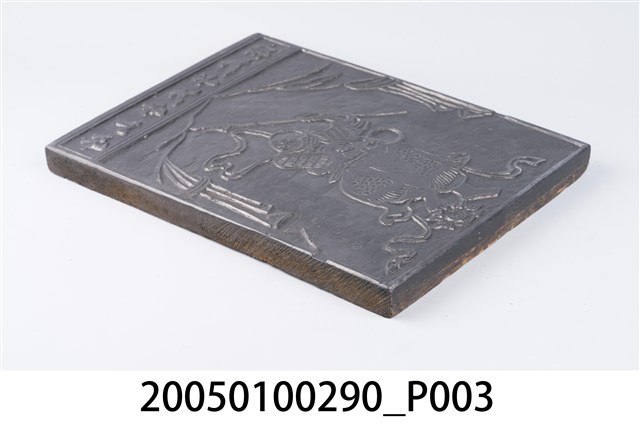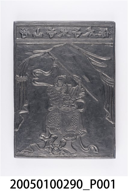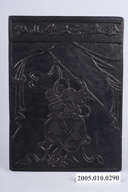 本件為竹山寺太子太保印版,上方為「竹山寺太子太保」字樣,畫面中一尊三太子。竹山寺位於臺中市烏日區。此項宗教版畫又稱「神禡」,民間俗稱「大符」,指的是紙製神像,以木刻印版印刷而成。請回家中可安放在神桌上或張貼在清淨處,加強神明守護家宅老少的平安。印版結合雕刻和印刷藝術,古代廣泛運用在刊印書籍,宗教民俗的版畫、符令、籤詩、疏文等印刷物上。