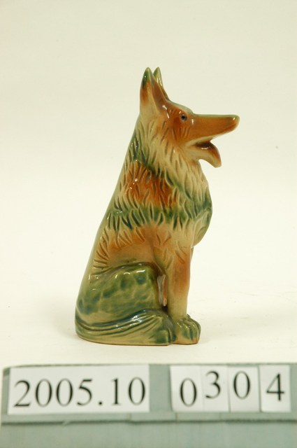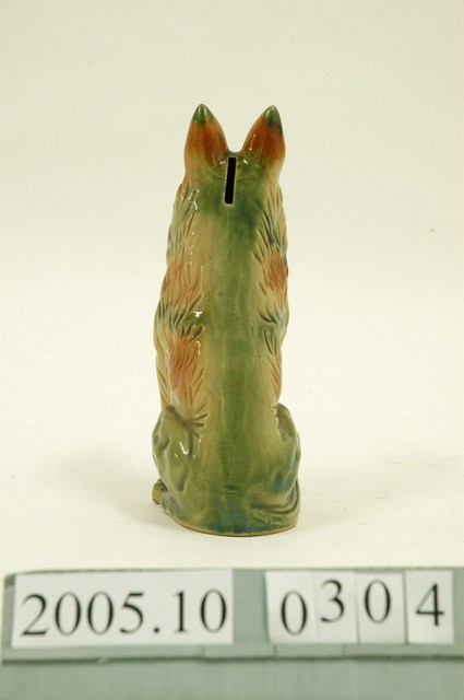 1.本件仿古唐三彩狼犬造型陶瓷儲錢筒,胚體以注漿而成,外型為一隻德國狼犬坐姿的造型,內心呈中空,狼犬後腦勺有一長方形開孔,可將錢幣投入其中儲存。仿照唐三彩,施以最具代表性的黃、褐、綠三種色釉,色釉之間濃淡變化、互相浸潤、色彩自然協調,除了儲錢的實用功能,亦具有妝點空間的擺飾功能。2.唐三彩是唐代盛行的一種釉陶,指唐代陶器上的釉色,唐代彩陶的釉色有很多種,如淺黃、赭黃、淺綠、深綠、天藍、褐紅、茄紫等,但主要以黃、綠、褐三色為主,所以稱之為「三彩」。3.戰後政府推動的中華文化復興運動,仿古藝術也成為流行的趨勢。1970年代鶯歌開始發展仿古陶瓷,以仿明清彩瓷為重心,帶動了仿古藝術陶瓷的發展。