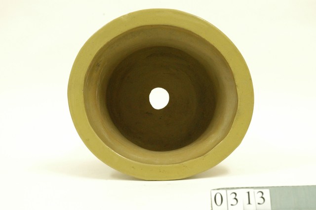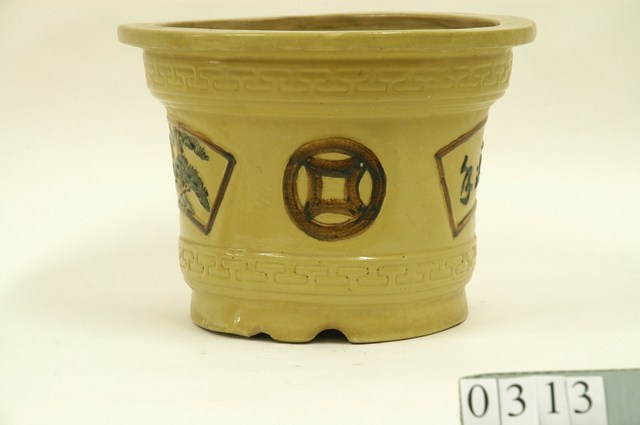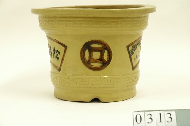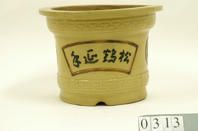 1.本件公館窯松鶴延年花盆,通身以陶土製作,採灌模成形後,表面施以淺褐色釉料燒製而成。外型作圓口,口緣外折出沿,下接轉折內縮,器身呈平直圓桶狀,底緣處作立板式環形圈足,並於邊緣製作有半圓形透孔。底面中央處帶有圓形透孔,作排水使用。器表兩側帶有圓形銅錢紋裝飾,正反兩面以扇形框作開光,一面書寫松鶴延年,一面以成雙丹頂鶴休憩於松樹枝幹為圖像。2.苗栗地區具有得天獨厚的優良黏土,天然瓦斯與煤炭,為非常適合發展陶瓷產業之地區。公館窯成立於1936年左右,產品大都以生活陶器皿為主,如大水缸、甕、缽、泡茶器具,以及裝