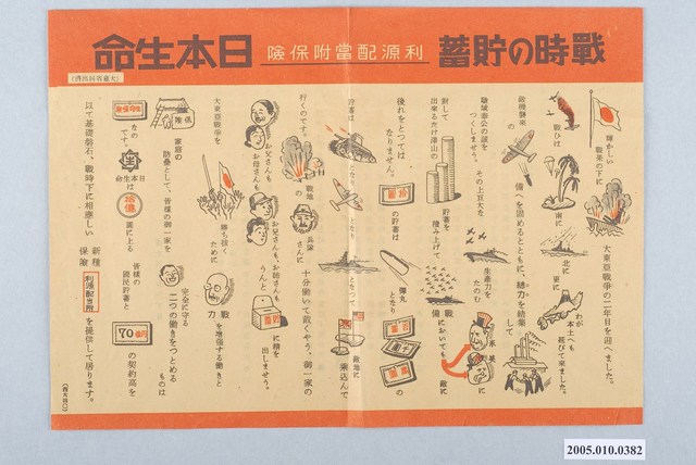 1.本物件為日本生命戰時貯蓄廣告,為戰時體制下,日本生命保險公司鼓勵儲蓄的廣告。正面為鼓勵大眾儲蓄的廣告詞,最上方的標題為「戰時の貯蓄 利源配當附保險 日本生命」,廣告詞圖文並茂,使用每句配合1個手繪圖案的方式講解。背面則為告知各代理店主的注意事項,最右方為日期「昭和十九年一月二十八日」、下方為「臺北市本町三丁目 日本生命臺北支店」。