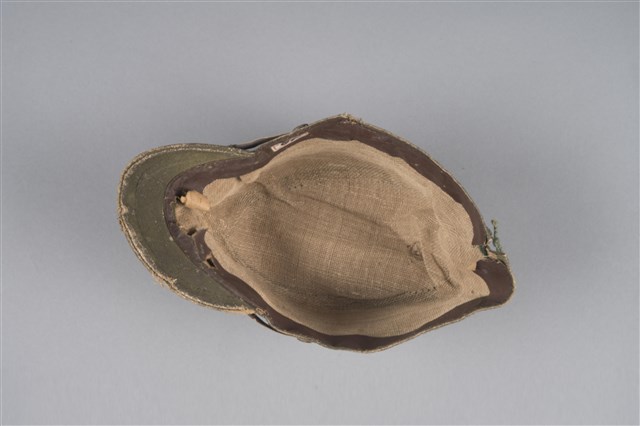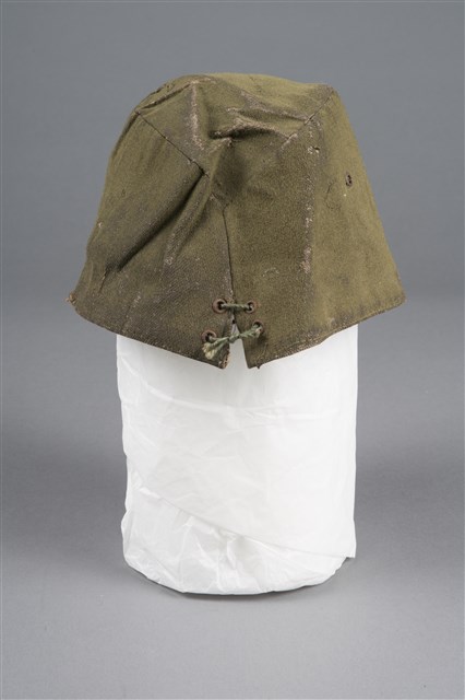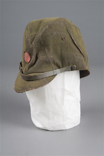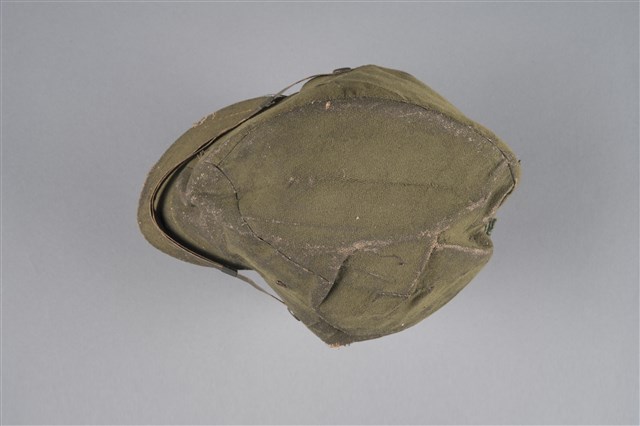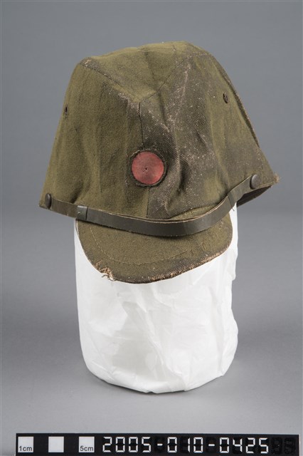 1.此件日本陸軍軟帽為軍綠色,帽子沒有骨架,十分柔軟,方便折疊攜帶,也可戴在鋼盔內。帽子後方有綁繩可調節帽圍。此軟帽在帽子正前方縫有一紅色圓形布,用以象徵日本。帽簷前端部分磨損,帽絆與帽釘均為軍綠色膠材。帽子內緣棕色皮革有些許磨損、脫線。2.此種陸軍軟帽相比大盤帽,配戴更加舒適且成本較低,所以很快就在戰場上普及。
