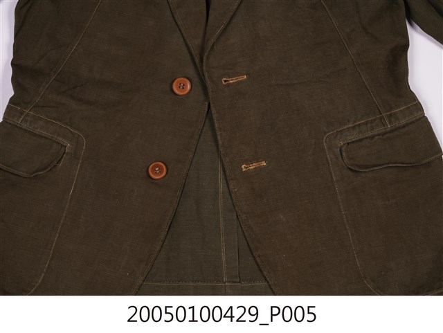 1.此服裝為單層結構,面料土黃色斜紋棉布,前開襟、西裝翻領、二顆四眼扣子、前身有二個帶有袋蓋的貼袋與胸前一個立式插袋,前身片做有腰身的褶子處理。袖子為二片袖,翻領得下片領上還有有一個釦眼,全衣為單層面料,沒有拷克處理布邊直接以雙次車縫的方式進行縫合。此服裝的領子(後頸)處有嚴重的破損,露出領子的內襯,顯見穿用的程度及歲月磨損的痕跡。2.此服原登錄「高座少年兵外套」,高座少年兵指的是1942年6月中途島之戰後,日軍為增產對抗美軍B-29轟炸機的「雷電」戰鬥機,在神奈川縣的「海軍航空技術廠相模野出張所」(空C廠,後來改為高座海軍工廠),在全島募集12.3歲至18.9歲的小學或中學畢業生前往高座廠造飛機,遠赴日本的臺灣少年工,被稱為「高座少年兵」。