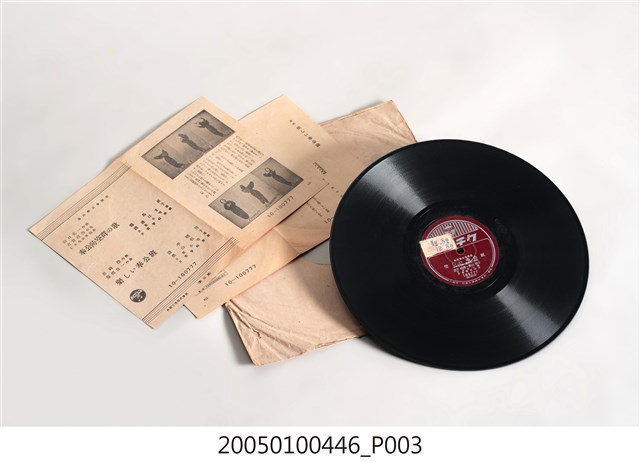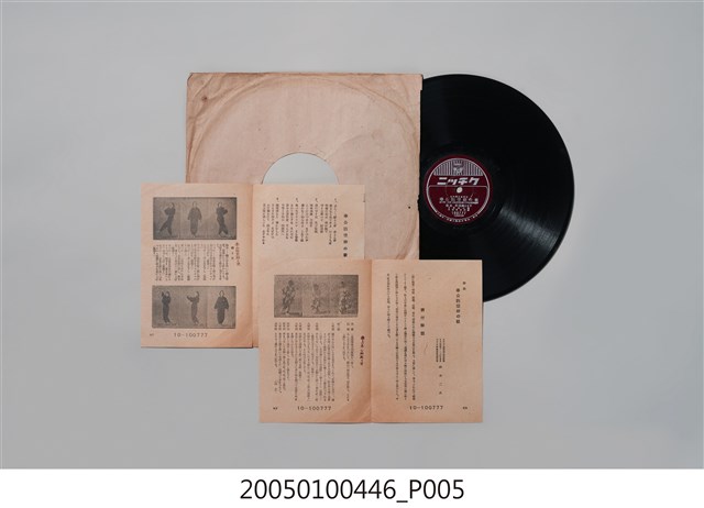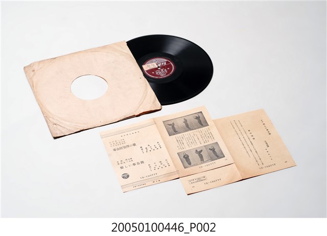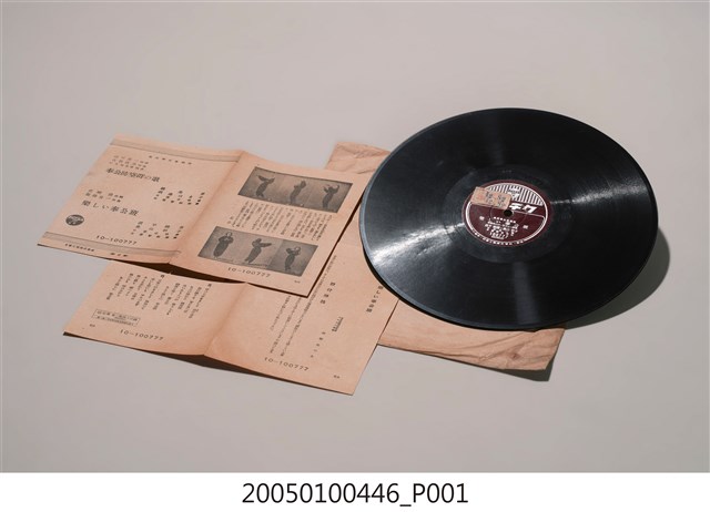 「二チック」出品唱片,編號為「100777」,正面為〈奉公防空群の歌〉(山口充一 詞/古賀政男 曲/霧島昇、渡辺はま子 唱),背面為〈楽しい奉公班〉(長崎浩 詞/服部良一 曲/波平暁男、奥山彩子 唱),2首歌皆標註「皇民奉公會制定」,1943年11月出版,日蓄工業株式會社製造,唱片商標為「赤盤」(紅色商標)。 本件唱片圓標上有貼上標籤,以標價章蓋上「¥2.82」字樣,應是指當時唱片的販賣價格。