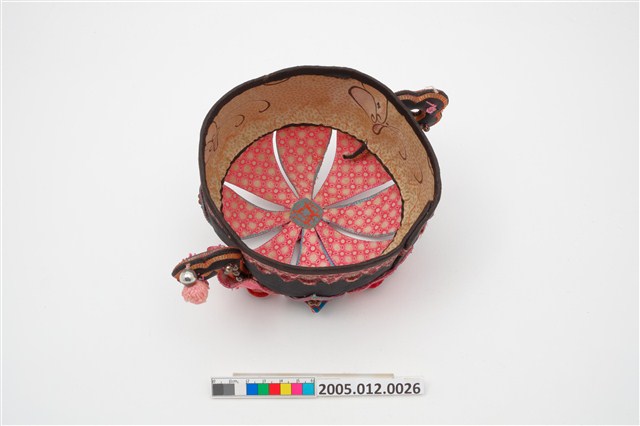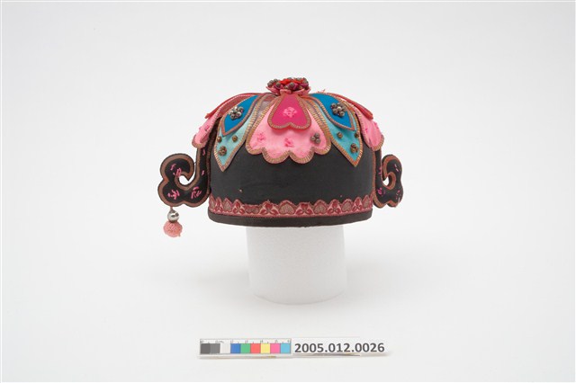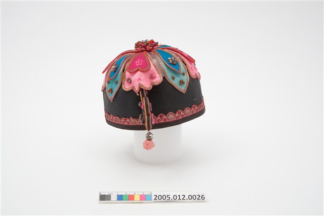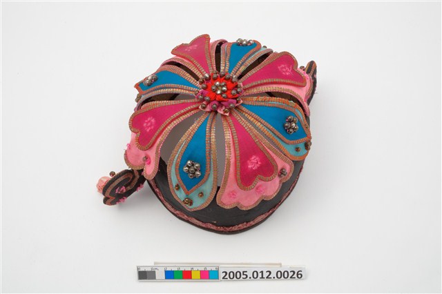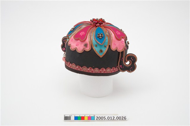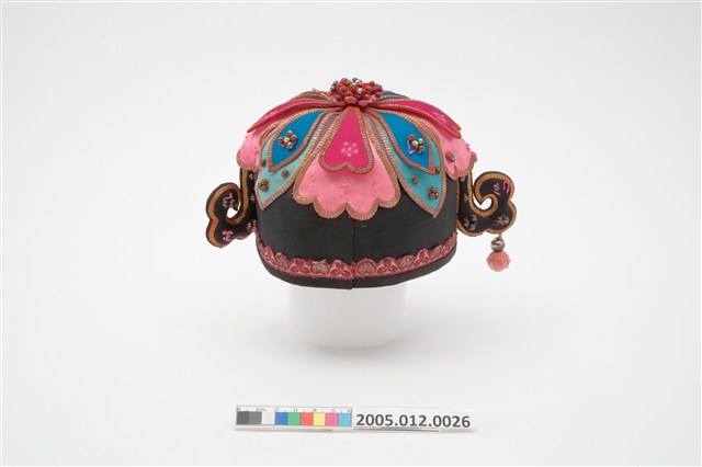 1. 由深淺不一的粉紅色及藍色布塊交疊縫製成花瓣,相間拼縫成花朵造型製成帽頂,接在黑色帽圈上,帽緣鑲有粉紅色心形紋織帶,左右兩側以黑色布片剪裁成䲭鴞帽的鳥頭造型。帽頂花瓣及䲭鴞布片皆以盤金繡緄邊,其上鑲有珠飾,部分已脫落,留下線頭,右側䲭鴞布片下方掛有銀色及紅色繡線製成的珠飾。帽頂正中央以紅、桃紅及粉紅色棉布漸層交疊,拼製成花蕊,並縫上珠飾。帽圈內裡為米色花紋織布,帽頂內裡為粉紅色花布。 2. 本物件的形制偏向瓜皮帽,但帽頂鏤空,左右有䲭鴞造型的布片,亦可歸類為䲭鴞帽。瓜皮童帽與成人的瓜皮帽形制相同,通常帽頂中央有鈕結,顏色多半為紅色或黑色。䲭鴞帽的特色是帽子的左右做成䲭鴞昂首的的造型。