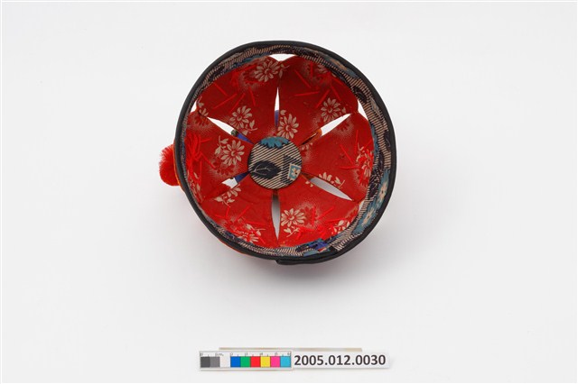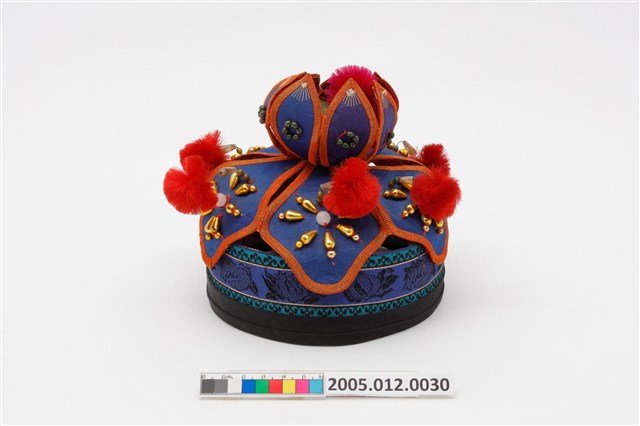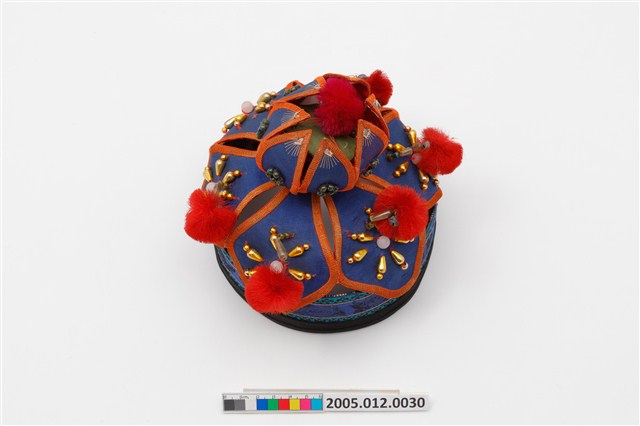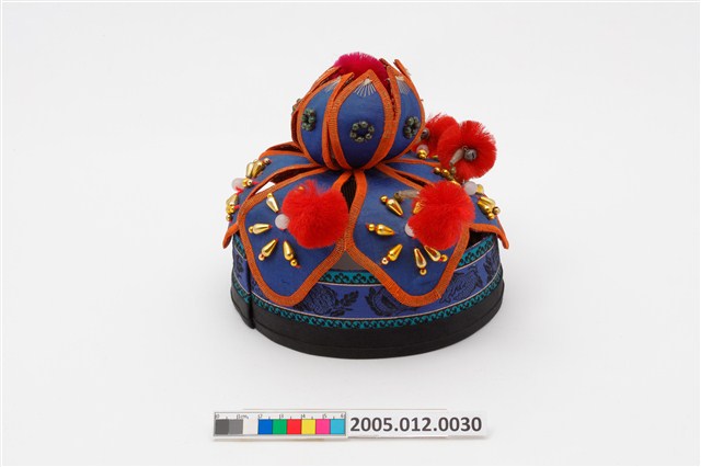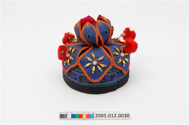 1. 帽圈以黑布為底,縫上籃黑色刺繡牡丹紋刺繡花布,帽頂以深藍色布片裁製成花瓣形狀,拼接成帽頂及鈕結,製成蓮花造型,花瓣邊緣以盤金繡緄邊,帽頂各花瓣上鑲有白色、金色珠飾、紅色毛球及鈴鐺,其中一瓣上的毛球和鈴鐺已脫落,鈕結各花瓣上則鑲墨綠色珠飾,中央縫有紅色毛球。 2. 本物件的形制偏向瓜皮帽,但帽頂鏤空。瓜皮童帽與成人的瓜皮帽形制相同,通常帽頂中央有鈕結,顏色多半為紅色或黑色。