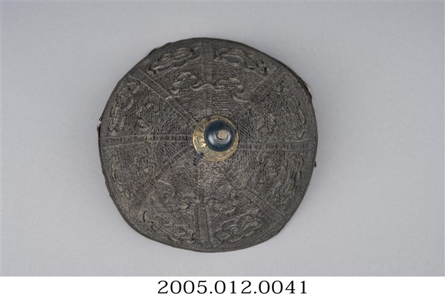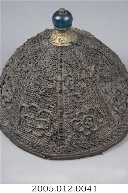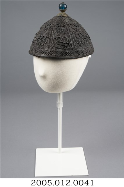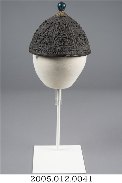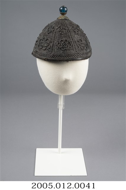 1.此件瓜皮帽採用編織方式製成,與一般分為六瓣的瓜皮帽不同,然而編織紋樣仍然分成六等份,分別在帽身下半部繡有雜寶紋,上半部則統一為如意雲紋。帽頂有藍色圓珠做頂珠裝飾。2. 此種帽子專屬男童、成年男子配戴,由於形狀半圓如西瓜,因而名為瓜皮帽。