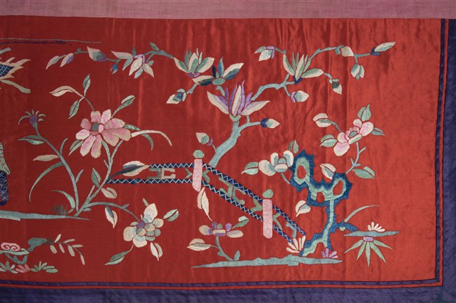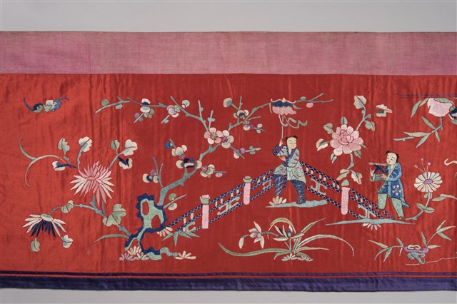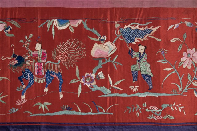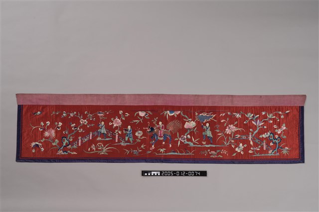 1. 本件主要圖框以紅布為底,採用一般彩繡。圖案意象在於中間人物童子騎乘麒麟,前有兩位童子分別手持傘蓋、吹笛作為引導,後方有一位手持大旗的童子相隨。整幅圖案背景是在花卉叢間,繞橋嬉戲,構成「麒麟送子」的吉慶畫面,富有熱鬧的意涵。