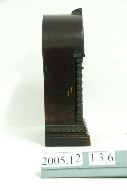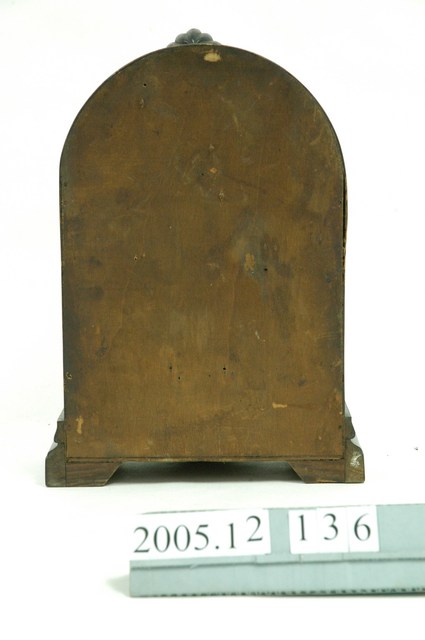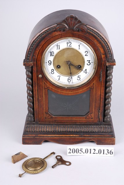 1. 圓頂式木雕座鐘組,共1組3件,包括座鐘、鐘擺及發條鑰匙3個部分。座鐘盒體及底座皆以木材製成,外觀呈半圓拱型,盒體正面圓頂中央浮貼貝殼及葉形裝飾,弧邊處雕刻串珠狀線條,左右兩側立有木雕螺旋柱,底座斜邊刻有直條紋飾。盒體作單側右開門設計,門框內夾兩塊透明玻璃,上方玻璃無任何紋飾用以顯示時間,下方玻璃帶有米字型葉紋裝飾,外圍作木雕線條及扇型飾角,透過玻璃可觀看鐘擺擺盪情況。門內上半部裝有圓形文字板,文字板中央以黃銅製圓盤為飾,盤內有發條孔洞,盤外以阿拉伯數字標記時間,文字板邊緣處同樣以黃銅飾邊。鐘擺為黃銅製,可以調整鐘擺長度,進而改變鐘擺擺動的速度。發條鑰匙用來插入文字板上的發條孔洞,藉由旋轉發條手動上鍊,給予座鐘走時的動力。