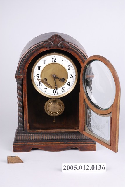 2. 傳統的座鐘通常放置於桌面或櫃面等平面上,透過掛置於機芯下方的鐘擺左右擺動,帶動指針規律轉動來計算時間。臺灣從日本時代開始引進格林威治標準時間及星期制,推動民眾養成守時觀念與習慣,進而促使時鐘逐漸普及於民間。日本時代的時鐘大多為木造盒體,內頭機芯由日本廠商製成,大致可分為原裝進口及臺灣組裝兩種類型。做工精良的座鐘兼具顯示時間及裝飾環境的功能。