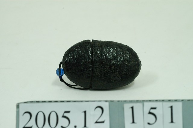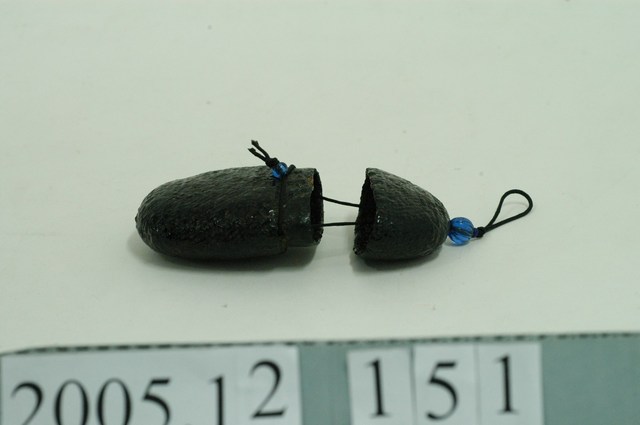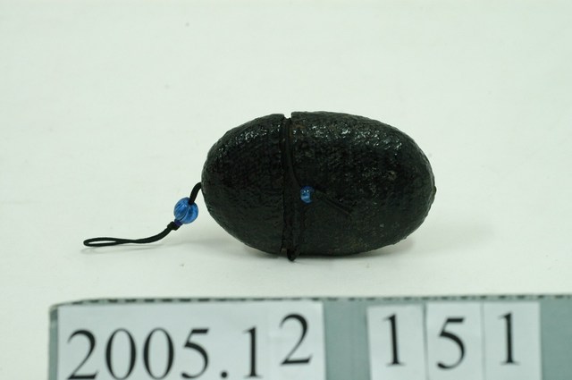 本物件為塑膠菸草盒,材質為塑膠,呈扁平橢圓形狀,顏色為黑色,表面凹凸不平,上半部分可分離,並有黑色棉線與2顆藍色塑膠珠之組件將上下兩部分相連,使物件不至於散落不同處,內為空心,可容納菸草等物。