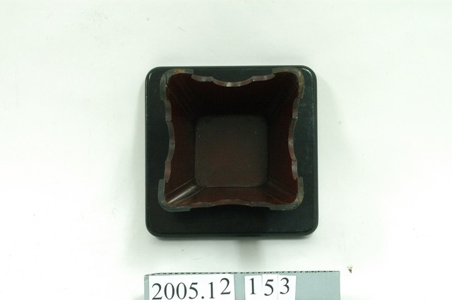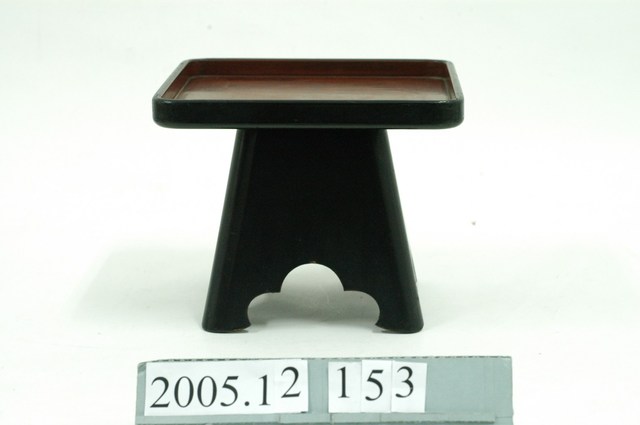 朱黑雙色高腳餐盤,正方形,四角圓弧,盤身側邊與底部垂直高起,略具深度,餐盤下方接有梯形高腳,上窄下寬,底部四邊挖有三圓弧之雲狀雕飾。木胎,餐盤與高腳的外側髹黑漆,內側塗褐紅色漆,素面無紋,造型簡單大方。