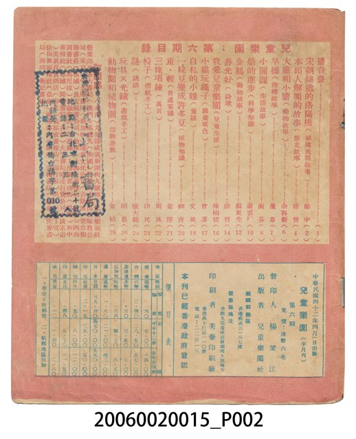 1.本件為《兒童樂園》第6期,彩色印刷,內容有福建民間故事、歷史故事、動物故事、詩歌、兒童生活、圖畫填色、童話、寓言、謎語等等。2.《兒童樂園》創刊於1953年1月,至1995年因為經濟問題停刊,於香港共出版1006期的兒童半月刊。全書彩色印刷,內容包含歷史故事、世界童話等等,取材新穎、內容健康。