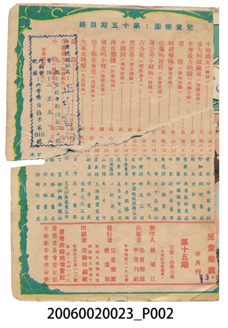 楊望江督印、兒童樂園半月刊社出版、兒童樂園營業部發行、美泰印刷廠印刷