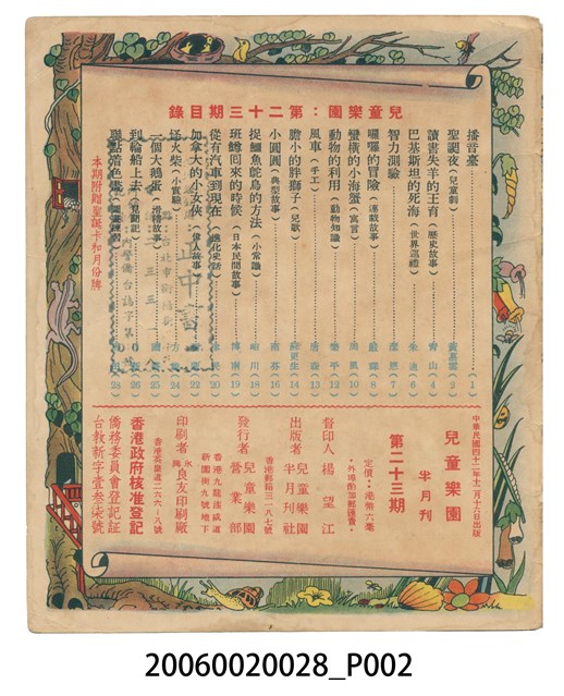 1.本件為《兒童樂園》第23期,彩色印刷,內容有兒童劇、歷史故事、世界巡禮、寓言、動物知識、兒歌、典型故事、小常識、日本民間故事等等。2.《兒童樂園》創刊於1953年1月,至1995年因為經濟問題停刊,於香港共出版1006期的兒童半月刊。全書彩色印刷,內容包含歷史故事、世界童話等等,取材新穎、內容健康。